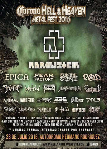La quinta edición del Corona Hell and Heaven Fest que se realizará el próximo sábado 23 de julio de 2016 en La Curva 4 del Autódromo Hermanos Rodríguez tendrá un cartel excepcional con lo mejor de la música con grandes agrupaciones como Rammstein, Twisted Sister, Five Finger Death Punch, Ghost, Epica, Amon Amarth, Behemoth, Sepultura, Fear Factory, Suicide Silence, P.O.D., Dragonforce, Mushroomhead, Suicidal Tendencies, Suffocation, Ensiferum, A.N.I.M.A.L., Voivod, Dying Fetus, Alien Ant Farm, Bulldozer, Koyi K Utho y Pinhed, entre otros.